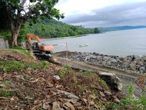 Narasitimur – Memasuki bulan kelima di akhir tahun 2025, progres pekerjaan pembuatan penguat tebing atau pantai di antara Desa Cio Gerong dan Cio Maloleo Kecamatan Morotai Selatan Barat, Pulau Morotai, Maluku Utara, belum juga rampung. Padahal sesuai kontrak kerja sama dengan pemda setempat melalui BPBD, pekerjaan harus selesai pada Desember ini.